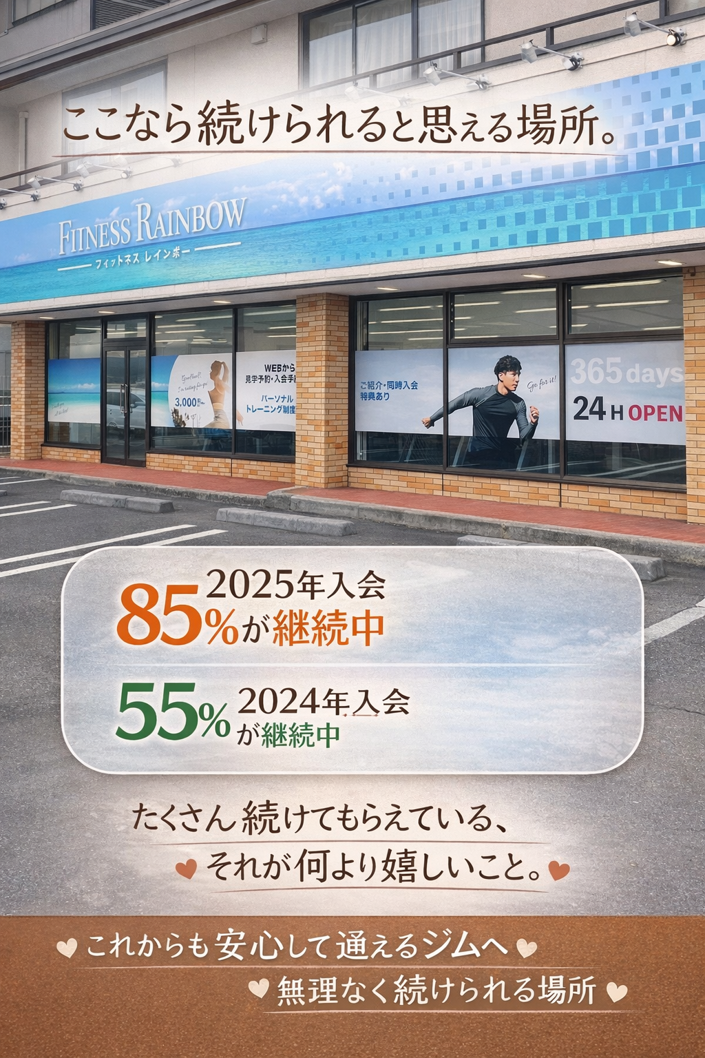 継続率の高さがレインボーの自慢です。 2026/02/19 ジムは続かない。 そう言われる業界ですが、 2025年に入会された方の85%が現在も継続中。 2024年入会の方も55%が今も通ってくださっています。 守山区・高蔵寺エリアで 「続けやすい24時間ジム」を目指し、 無理なく通える環境づくりを大切にしています。 清潔で安心できる空間を整え、 女性の方や運動が苦手な方にも選ばれています。 高蔵寺周辺でジムをお探しの方は、 ぜひ一度ご見学ください。